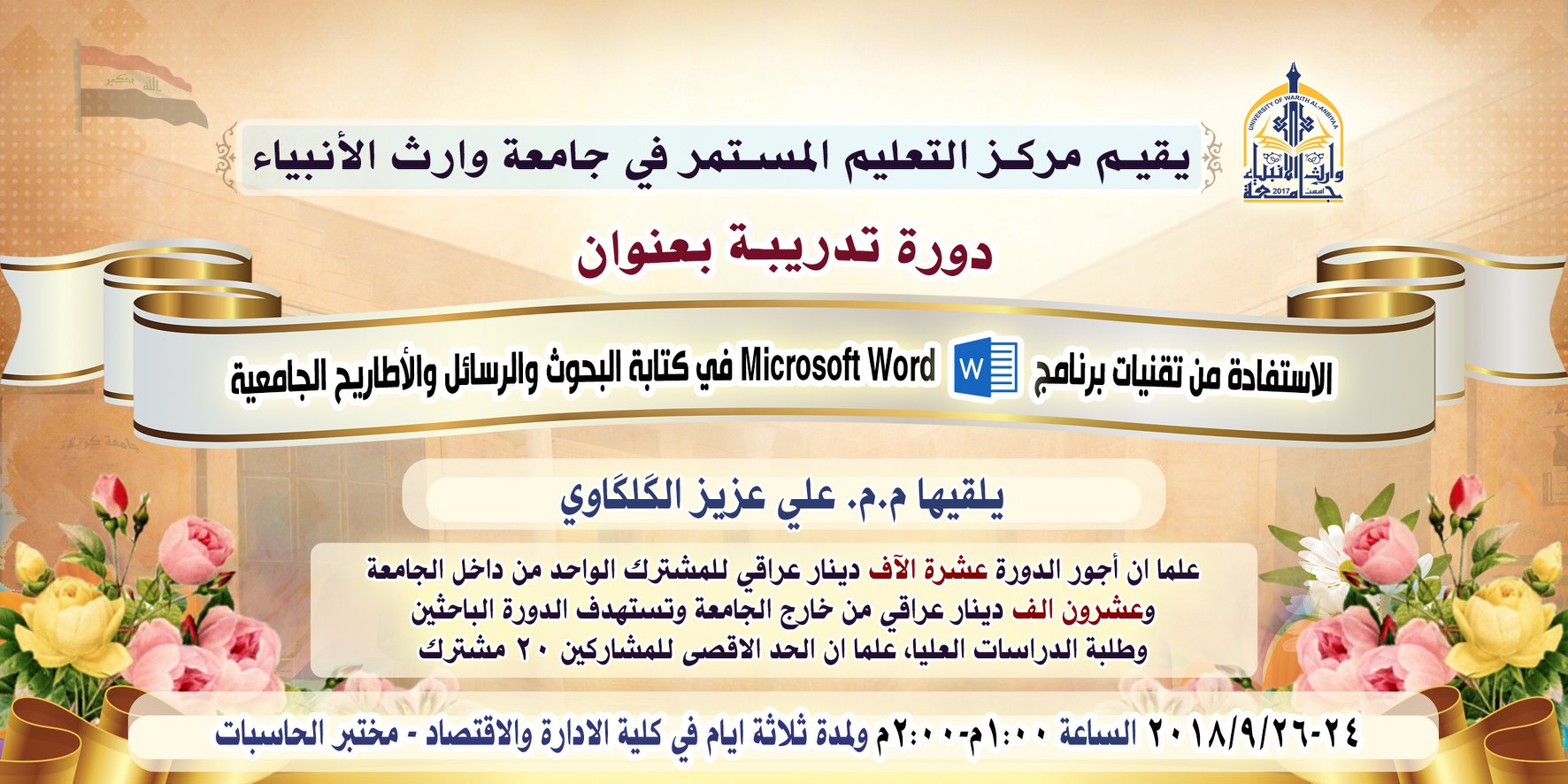 اقام قسم التعليم المستمر وبالتعاون مع كلية الادارة والاقتصاد دورة تدريبية بعنوان(Microsoft Program, Word, Excel and Access) لملاكات وموظفي وطلبة الجامعة، وقال المبرمج مصطفى عباس الدعمي ان الدورة عقدت للتعريف بهذه البرامج وكيفية التعامل معها باحترافية لتسهيل العمل المؤسسي والاداري والتي استمرت لمدة اسبوعين، واضاف انه في نهاية الدورة سيكون هناك امتحان لكل المشاركين وشهادات مشاركة مصدقة من قبل جامعة وارث الانبياء و هناك دورات اخرى متقدمة حول Advance, PowerPoint في الايام القادمة