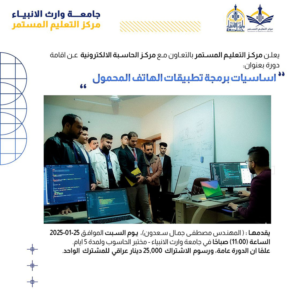 جامعة وارث الأنبياء تفتح التسجيل لدورة أساسيات برمجة تطبيقات الهاتف المحمول