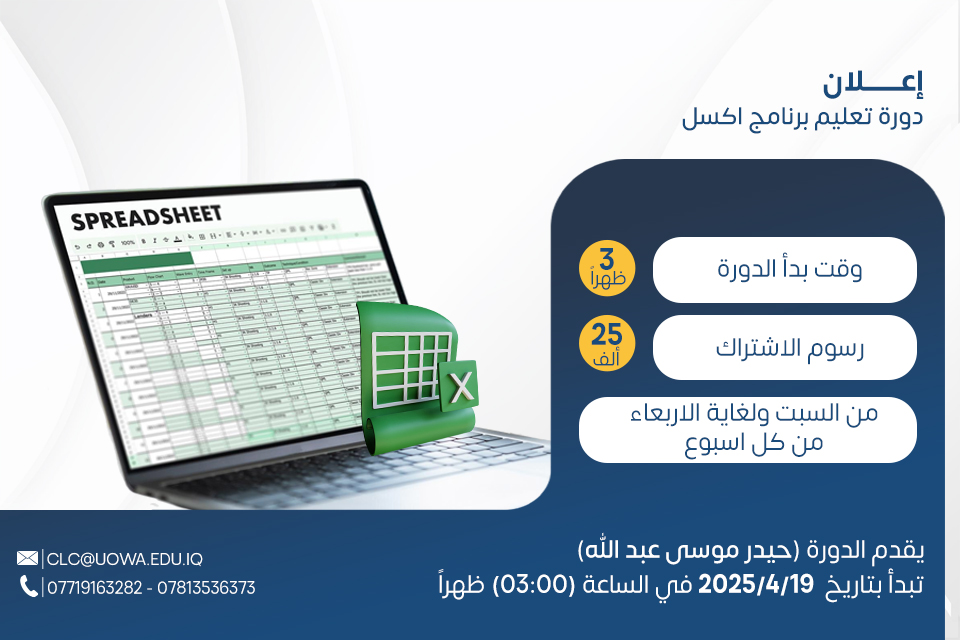 يسر مركز التعليم المستمر في جامعة وارث الأنبياء (عليه السلام) الإعلان عن فتح باب التسجيل في دورة تعليم برنامج Excel، التي ستنطلق يوم السبت الموافق 19/04/2025، بإشراف المدرّب حيدر موسى عبد الله.