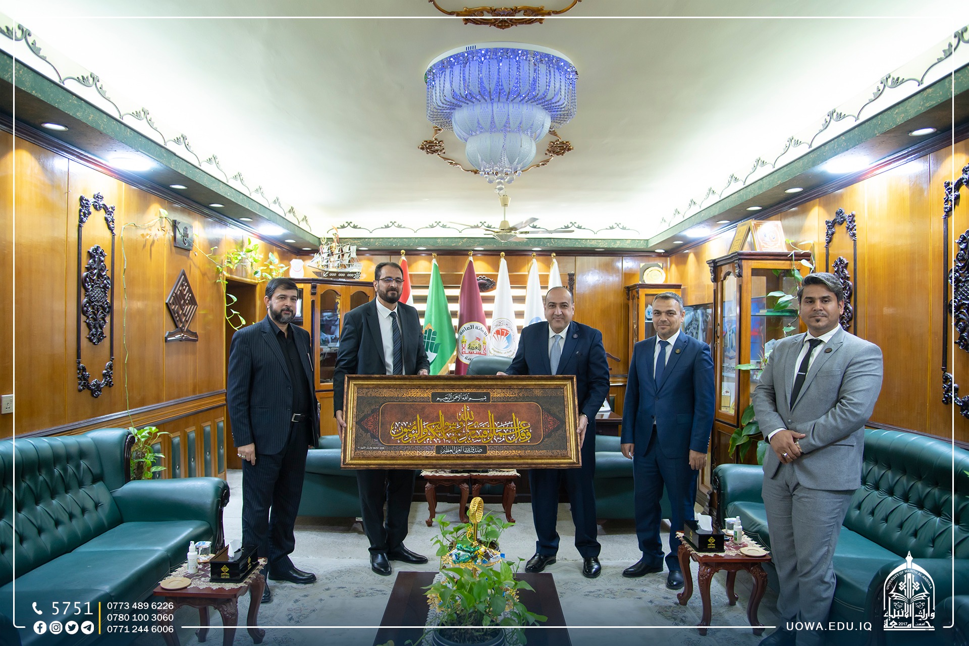 The President of the University, Dr. Ibrahim Al-Hayawi, received Dr. Basim Khalil Al-Saadi, the President of the University of Karbala, along with Dr. Akram Al-Yasiri, the Administrative Assistant. They visited the university to offer their congratulations to Dr. Hussein Hadi Hussein, Assistant Professor, on the occasion of his assumption of the deanship of the College of Engineering. They pray for his success in serving the scientific journey in our beloved country.