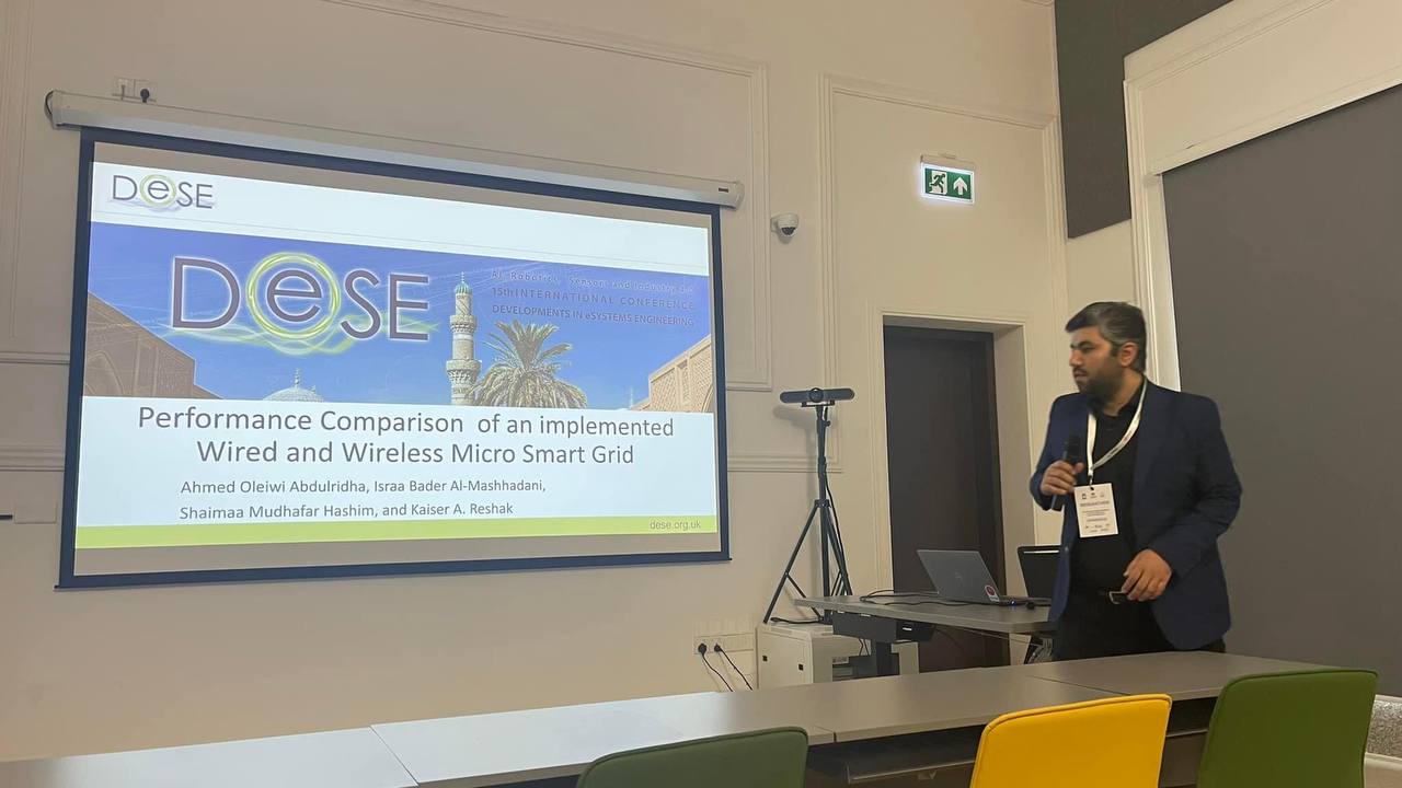 Assistant Professor Ahmed Aliwi and Assistant Professor Qaisar Abdul-Hussein from the College of Engineering participated in the "15th International Conference on Developments in eSystems Engineering (DeSE2023)." Their contribution to the conference included a scientific research paper titled "Performance Comparison of an Implemented Wired and Wireless Micro Smart Grid."