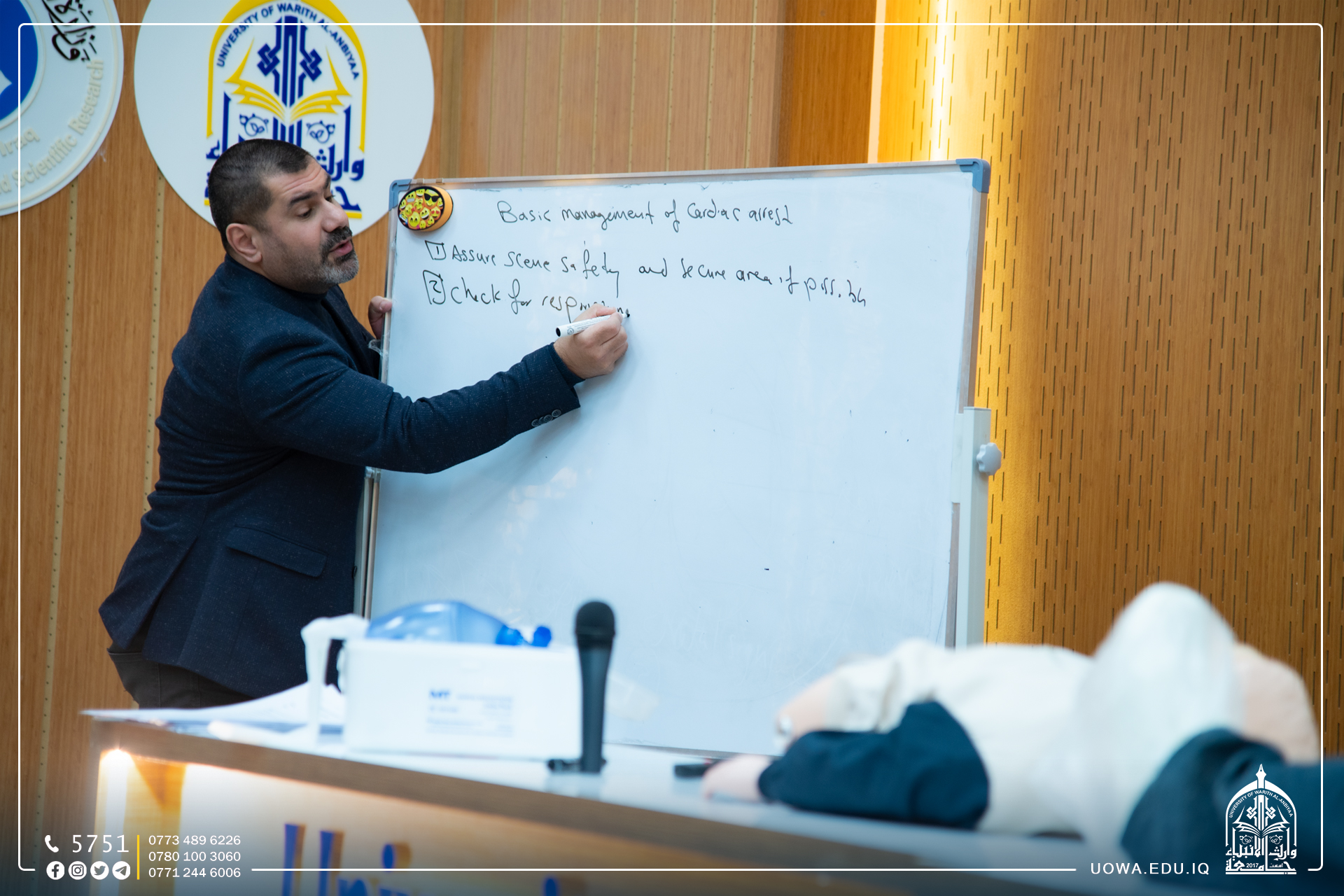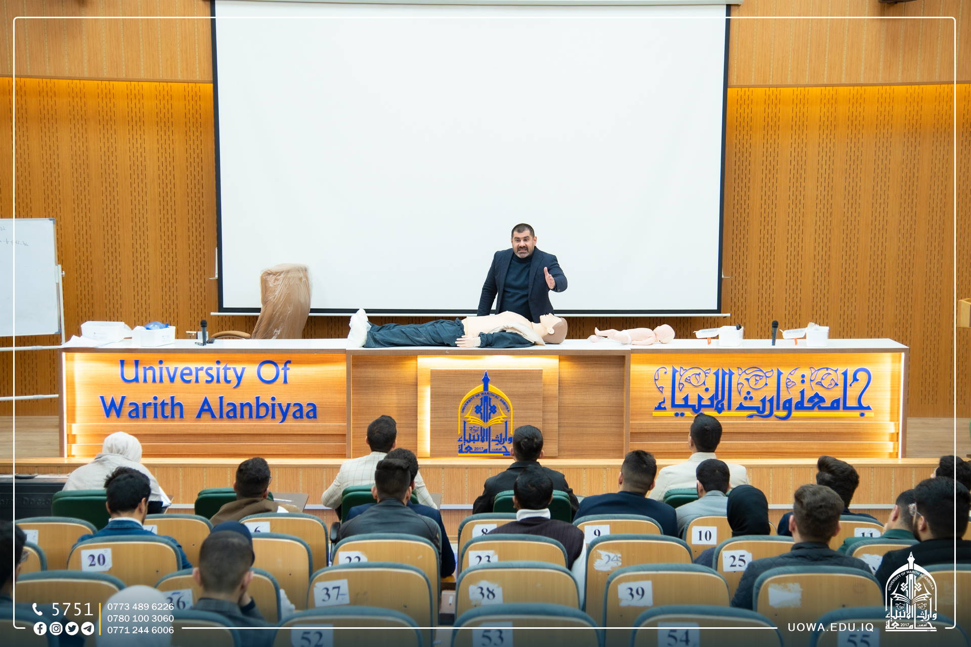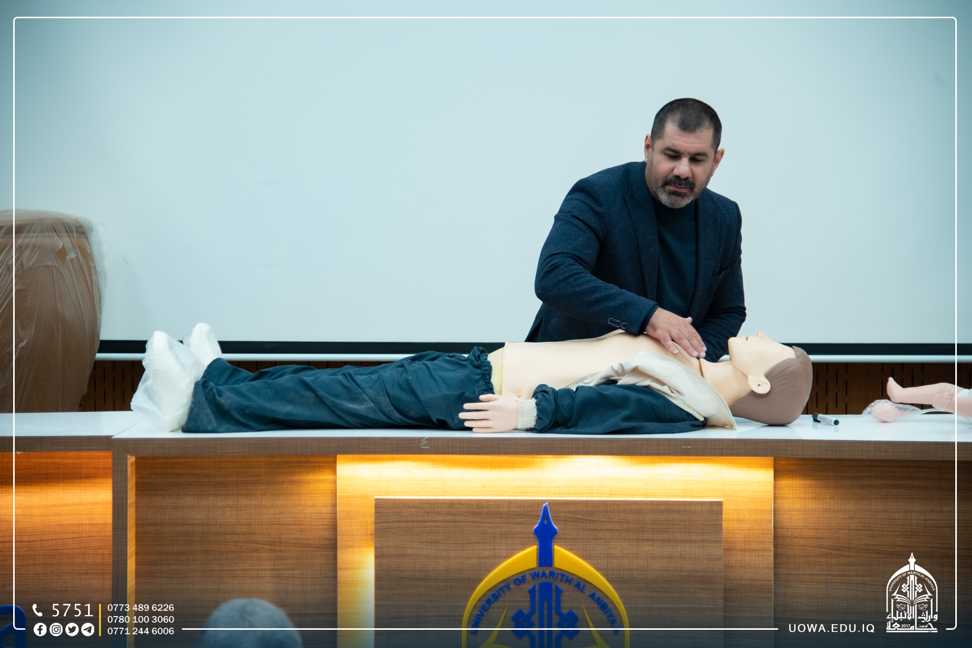 The College of Medicine at Warith Al-Anbiyaa University (peace be upon him), in collaboration with the "Regional Center for Emergency Medicine," held a training workshop on the fundamentals of life-saving for seniors and children. This workshop was presented to first-year students by emergency medicine specialists.