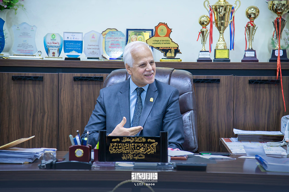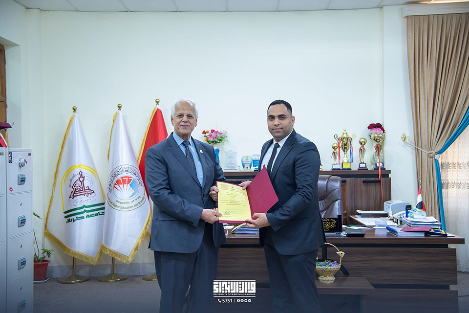 Upon receiving his PhD, Dr. Hussein Maatouq, the assistant dean of the College of Administration and Economics, was congratulated by Dr. Akram Al-Yasiri, who also wished him continued success in supporting education in our beloved nation.