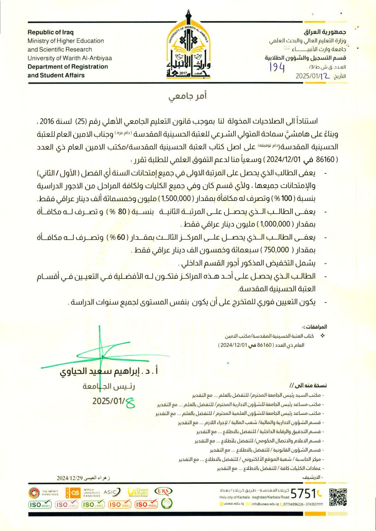 The student who achieves the first rank in all exams of the year, including both semesters (first/second) and all tests, in any department, college, or academic level, will be exempted from 100% of tuition fees and will receive a reward of 1,500,000 IQD (one million and five hundred thousand Iraqi dinars).