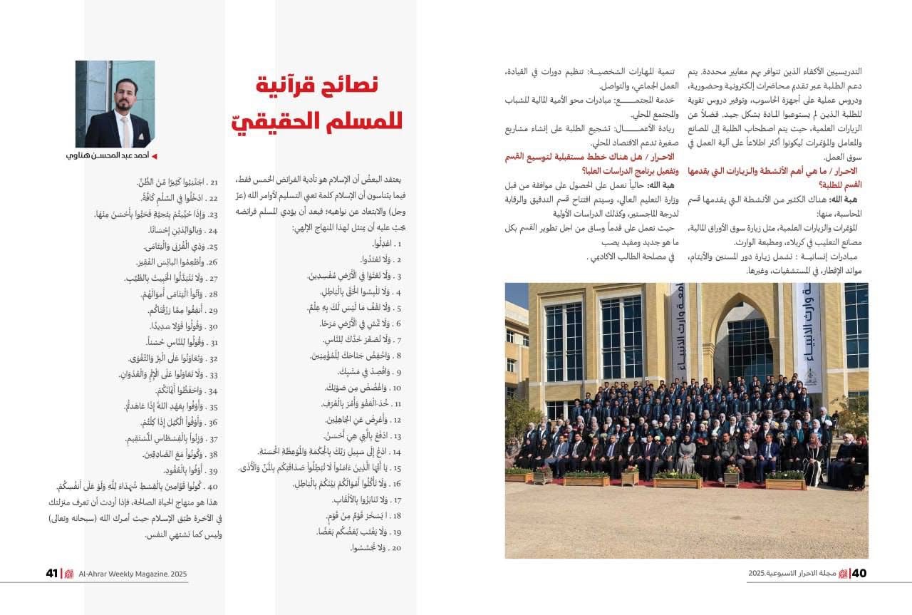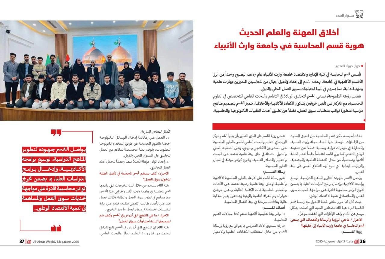 Al-Ahrar Magazine, published by the Publishing Division of the Media Department at the Holy Hussayniya Shrine, featured an insightful interview conducted by colleague Hawraa Masri, a second-year student in the Digital Media Department, with Dr. Hebatallah Mustafa Al-Sayyid, Head of the Accounting Department.