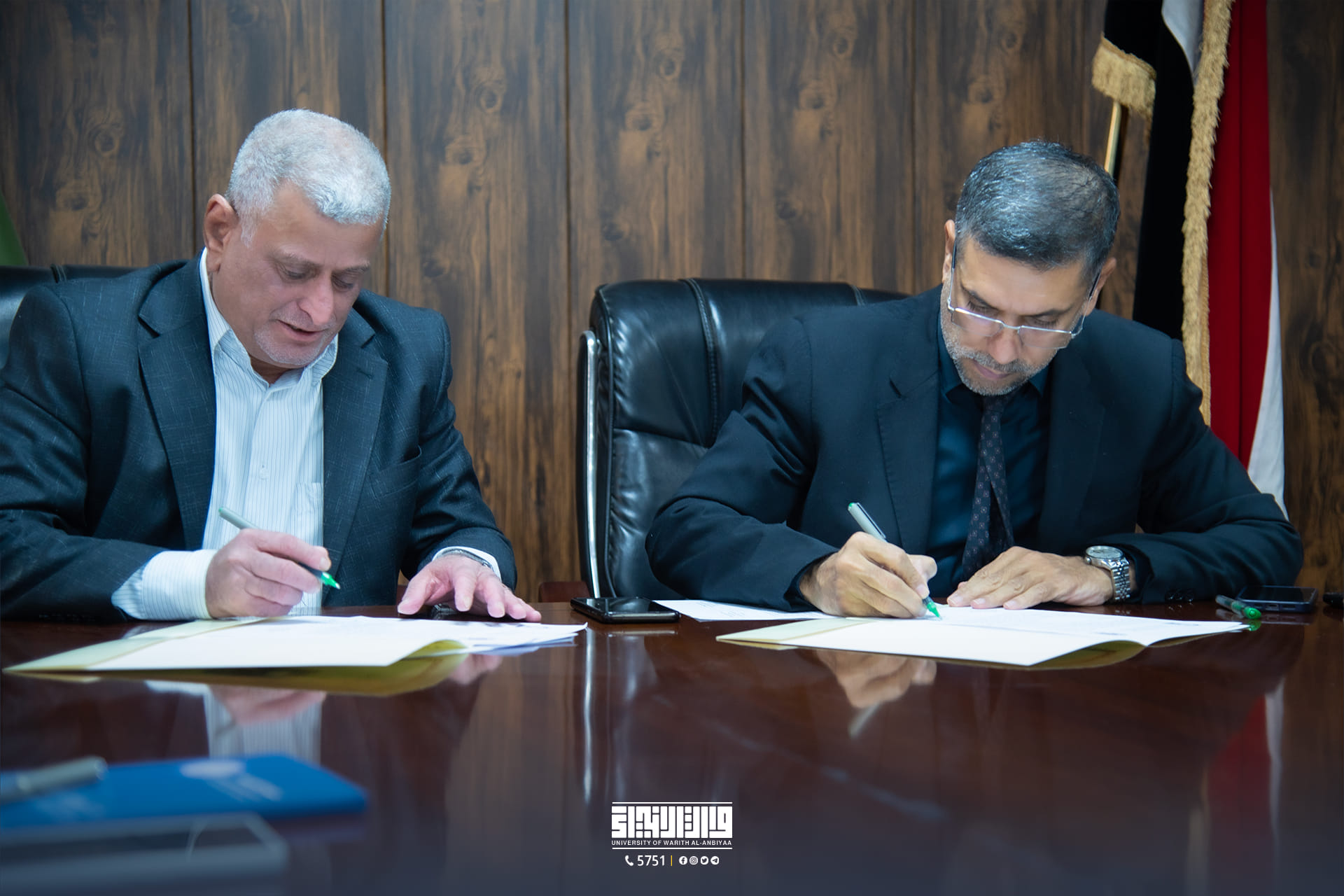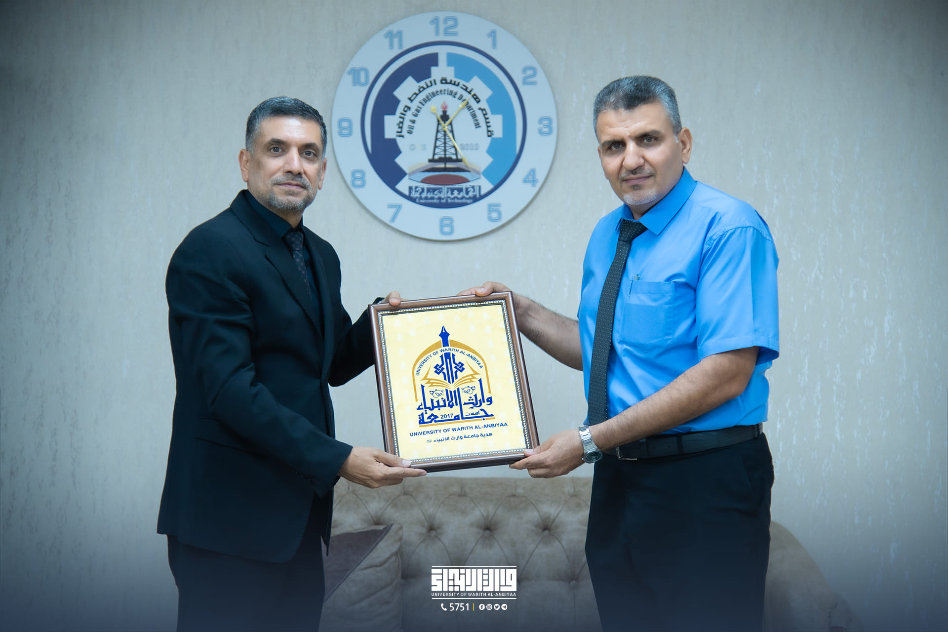 The Dean of the College of Engineering at the University of Warith Al-Anbiyaa (peace be upon him), Assistant Professor Dr. Hussein Hadi Al-Awadi, and his accompanying delegation signed a twinning and joint cooperation agreement with the Head of the Department of Oil and Gas Engineering at the University of Technology, Professor Dr. Fadel Sarhan Kazem.