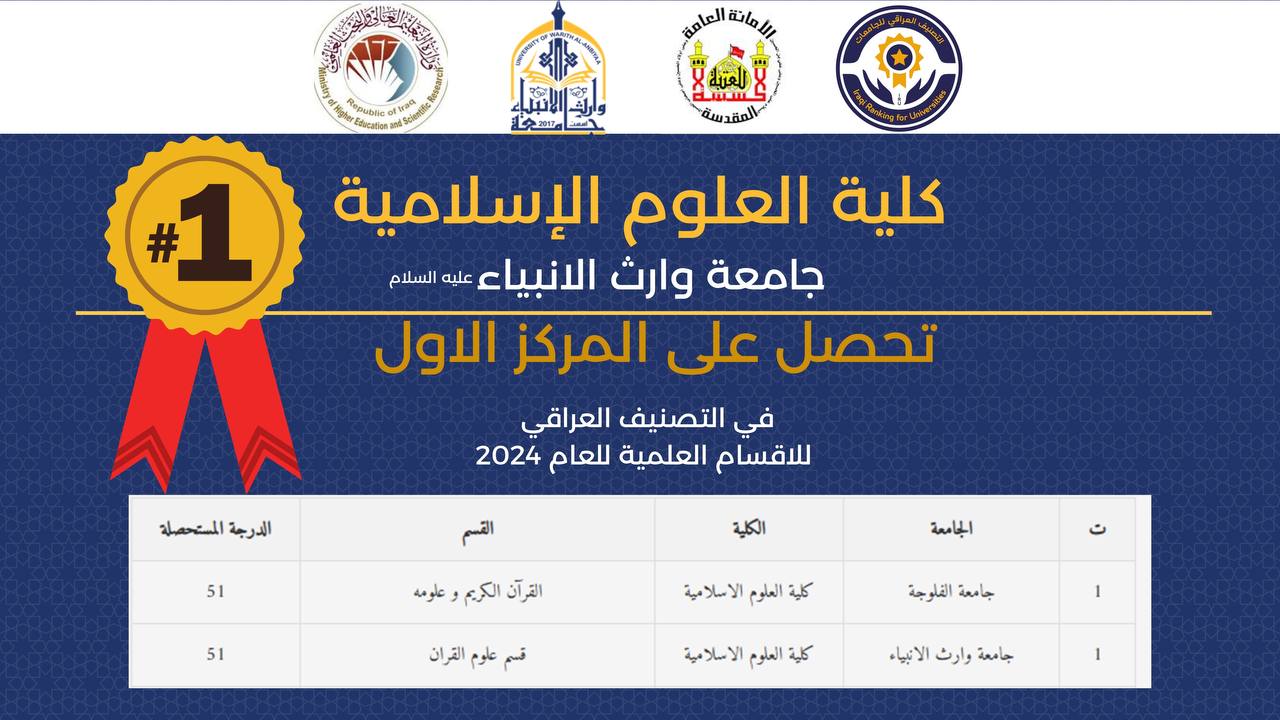 The Department of Quranic Sciences at the College of Islamic Sciences at Warith Al-Anbiya University obtained first place in the national classification of scientific departments. This achievement came as a result of the department's keenness to apply quality standards and program accreditation.