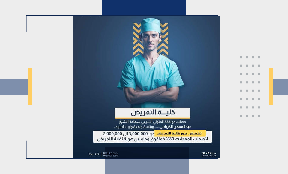 Under the guidance of the Holy Shrine of Imam Hussein (PBUH), the University of Warith Al-Anbiyaa announced a reduction in tuition fees for the College of Nursing for students with an academic average of 80% or higher.