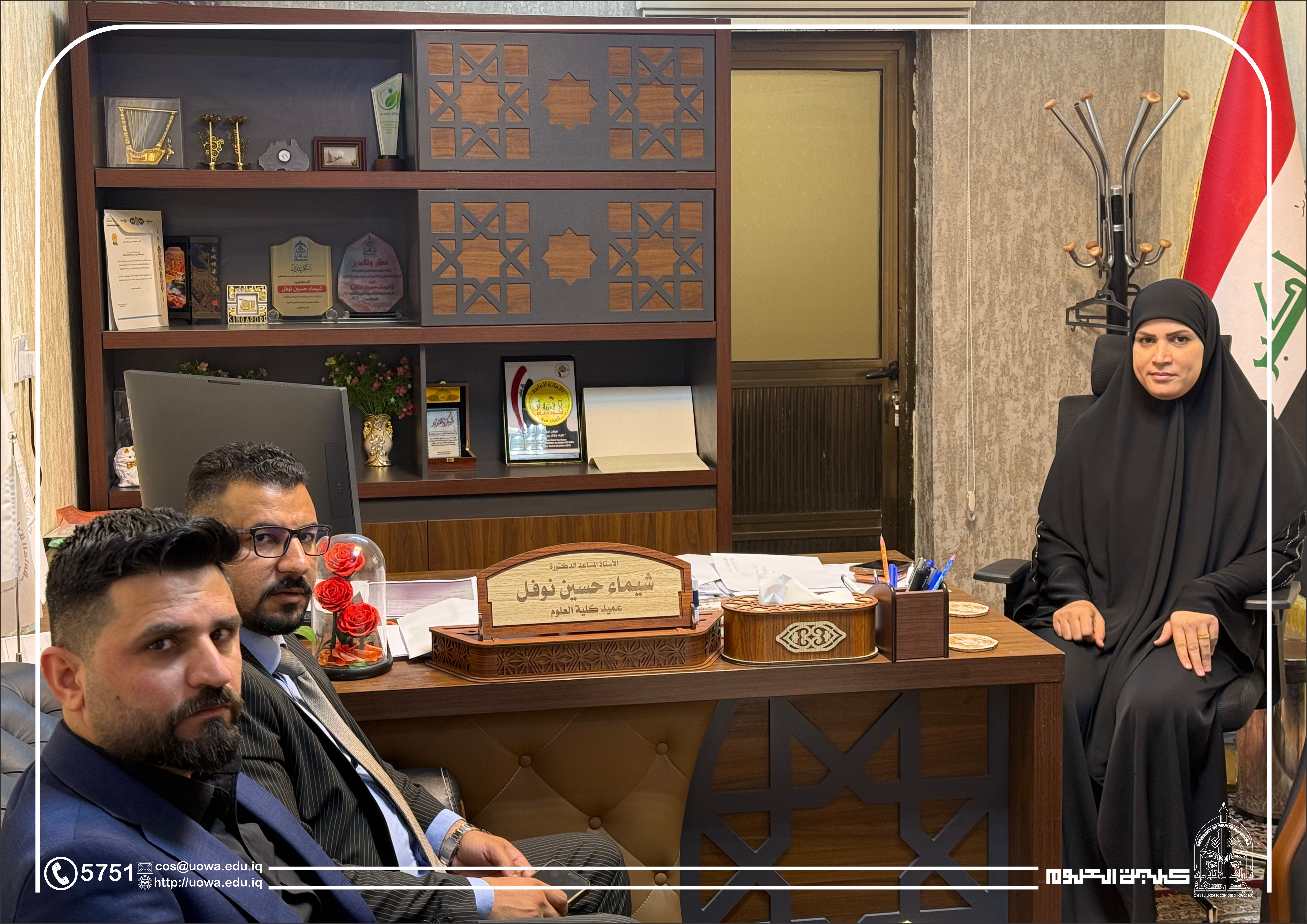A delegation from the Higher Ministerial Committee for Intellectual and Cultural Affairs in Universities, formed by the Minister of Higher Education and Scientific Research, visited the University of Warith Al-Anbiyaa (PBUH). The delegation was led by Prof. Dr. Haider Al-Tamimi and met with Dr. Talal Al-Kamali, Dean of the College of Islamic Sciences and a committee member.