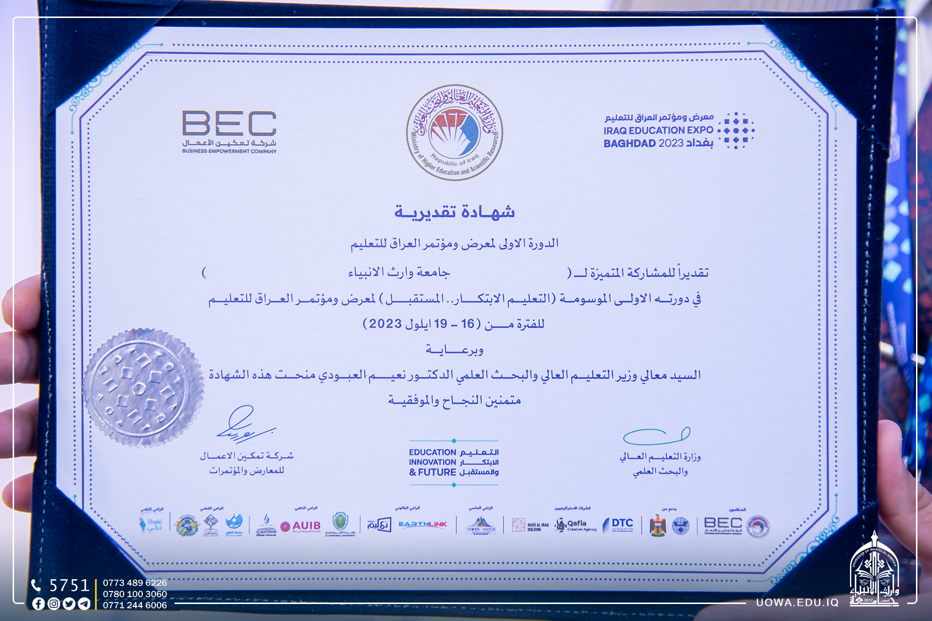 Wraith Al-Anbiyaa University was honored at the "Iraq Education Exhibition and Conference."