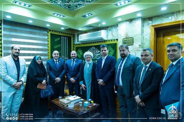 The delegation from the Presidency of the Technological University has the honor of meeting with the legal custodian of the Holy Hussein Shrine, His Eminence Sheikh Abdul Mahdi Al-Karbalai (may his glory endure), on the sidelines of their visit to the